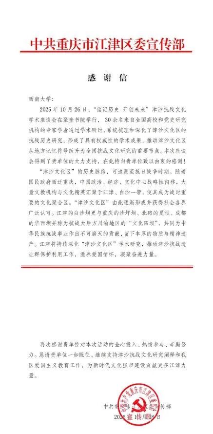 10月26日,在中国人民抗日战争暨世界反法西斯战争胜利80周年之际,“铭记历史 开创未来”津沙抗战文化学术座谈会在重庆市江津区白沙镇聚奎书院成功召开。本次座谈会由中共重庆市江津区委宣传部、中共重庆市江津区委党史研究室、重庆市江津区文化和旅游发展委员会、重庆市江津区白沙镇人民政府、西南大学历史文化学院主办,由重庆市历史学会、重庆市重庆史研究会、重庆市抗战大后方历史文化研究会、西南大学指导。会后,中共重庆市江津区委宣传部特向西南大学发出感谢信,对学校为举办此次高规格学术活动作出的重要贡献表示感谢。