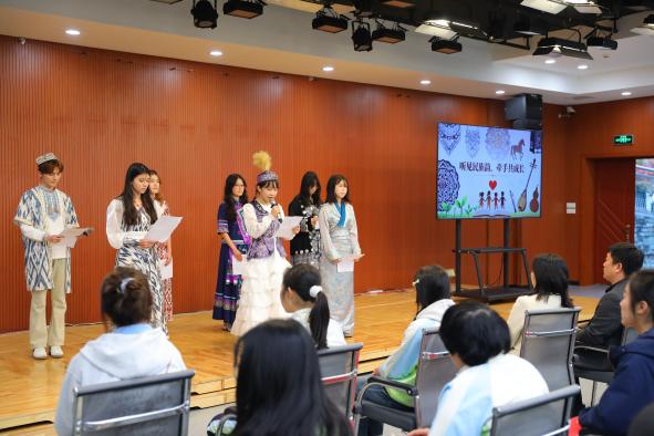 “这是白族的服饰,姑娘们头饰上的流苏,讲述着‘下关风,上关花,苍山雪,洱海月’的美丽故事”“这个花纹采用了黎族特有的黎锦技艺”......伴随着讲解,少数民族哥哥姐姐引导孩子们的手指轻轻抚过刺绣的纹路、银饰的光滑,在指尖的方寸间,展开了一幅绚丽的民族画卷。