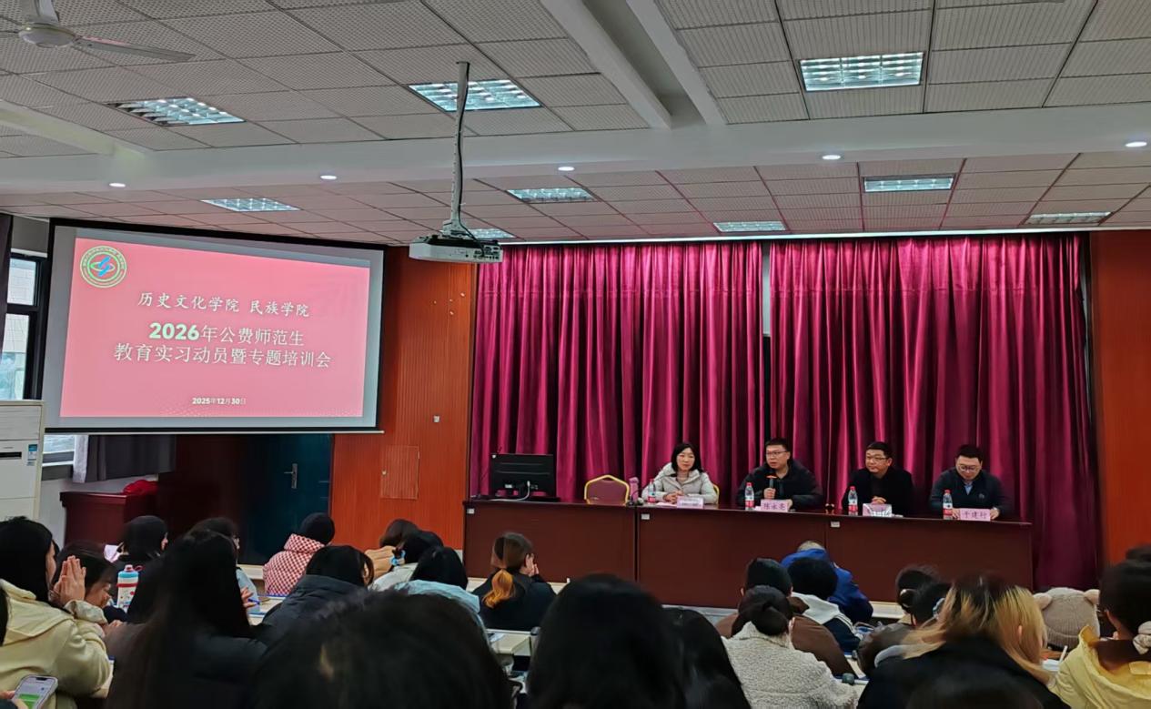 为扎实做好2023级公费师范生教育实习工作,引导学生明确实习任务与要求,顺利完成从学生到准教师的角色转变,历史文化学院 民族学院于2025年12月30日在第九教学楼505教室召开2026年公费师范生教育实习动员暨专题培训会。教师教育学院副院长杨挺、师范生实践教学中心主任于建行、历史文化学院 民族学院副院长陈永亮、副书记张静、教育实习指导教师、教育实习专题培训校外专家、2023级辅导员及全体公费师范生共同参会。