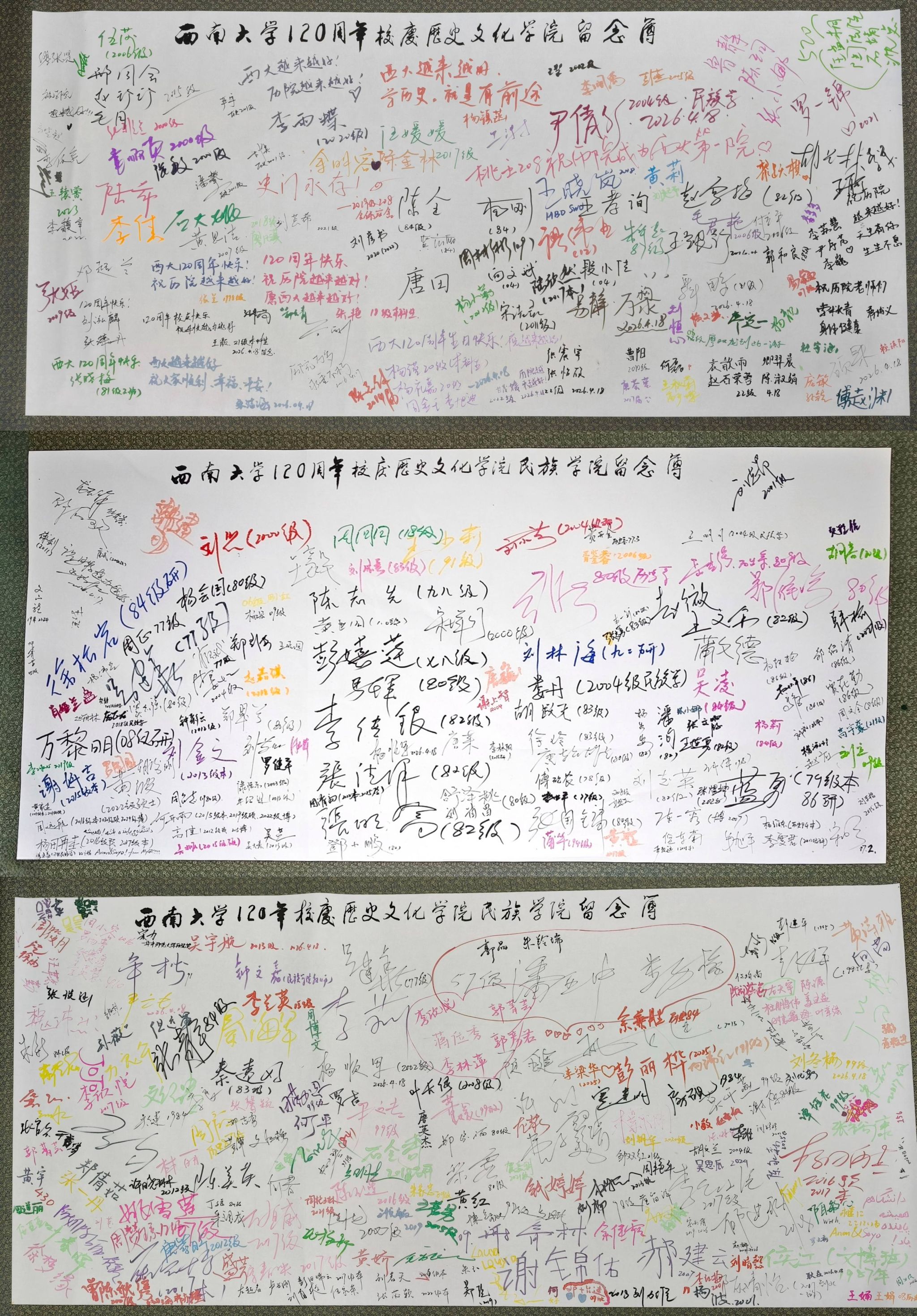 情牵百廿,缘聚今朝。自4月17日起,历史文化学院 民族学院陆续迎来各届校友五百余人荣返母院。学院大厅装扮得喜庆温馨,相机定格下一张张灿烂的笑脸,一批批满怀思念与激动的毕业生相继归来,处处洋溢着热烈而亲切的团聚氛围。校友们纷纷在纪念簿上郑重签名、题写祝福,“祝母校生日快乐”“我永远热爱西大”“愿母院越办越好”“感恩母校,铭记师恩”……一句句发自肺腑的真情告白,道出了对母校与学院的深厚情谊和浓浓祝福。