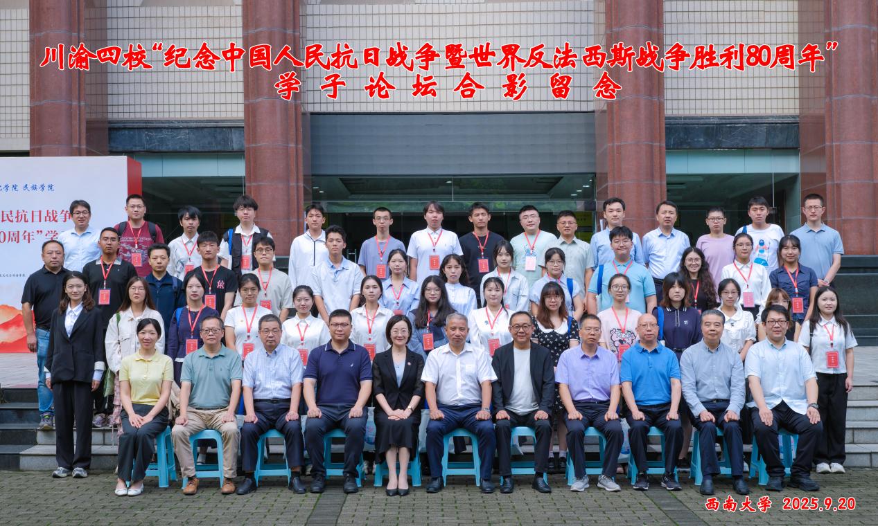 今年是中国人民抗日战争暨世界反法西斯战争胜利80周年,为传承和弘扬伟大抗战精神,牢记历史、缅怀先烈,赓续红色血脉,由西南大学历史文化学院 民族学院、重庆师范大学历史与社会学院、四川师范大学历史文化与旅游学院、西华师范大学历史文化学院联合举办的川渝四校“纪念中国人民抗日战争暨世界反法西斯战争胜利80周年”学子论坛,于2025年9月20日在西南大学隆重进行。本次论坛由我院承办,旨在通过学术交流的形式追忆那段波澜壮阔、艰苦卓绝的伟大历史,缅怀先烈们的丰功伟绩和不朽精神;深刻理解抗日战争作为世界反法西斯战争东方主战场的历史地位和重大贡献;激励新一代青年将伟大抗战精神转化为推动民族复兴的强大动力,勇担时代使命。