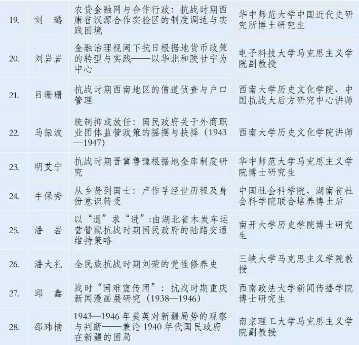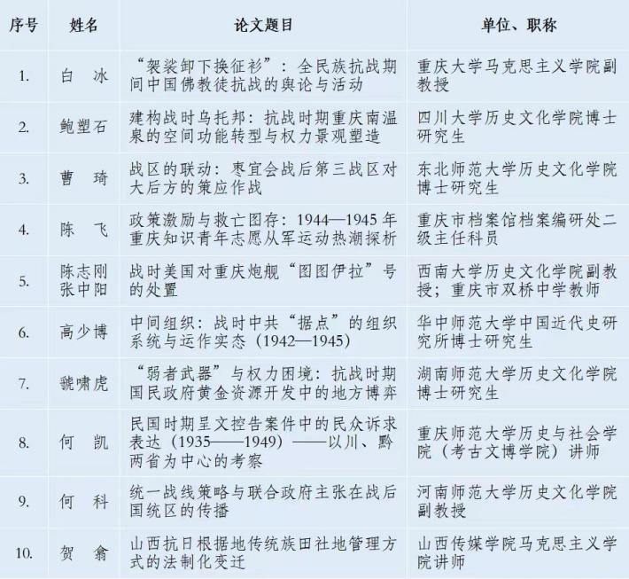 由《抗日战争研究》编辑部、西南大学历史文化学院主办,西南大学中国抗战大后方研究中心、重庆大学历史学系承办的“第十届中国抗战大后方研究论坛”,将于2025年10月24—26日在重庆召开。此前,会议公开征文。经评审委员会认真评议,遴选出45篇论文参加本次会议。现将入选论文名单公示于下。