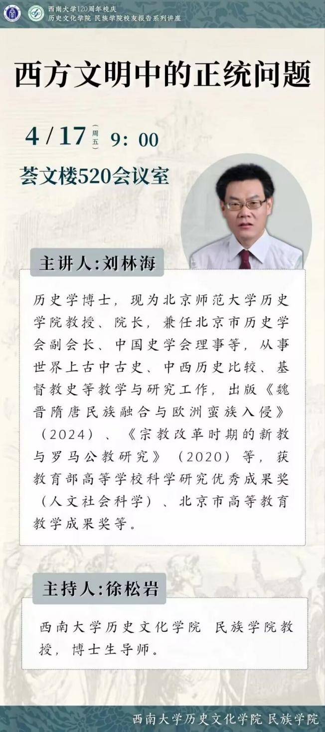 刘林海,历史学博士,现为北京师范大学历史学院教授、院长,兼任北京市历史学会副会长、中国史学会理事等,从事世界上古中古史、中西历史比较、基督教史等教学与研究工作,出版《魏晋隋唐民族融合与欧洲蛮族入侵》(2024)、《宗教改革时期的新教与罗马公教研究》(2020)等,获教育部高等学校科学研究优秀成果奖(人文社会科学)、北京市高等教育教学成果奖等。