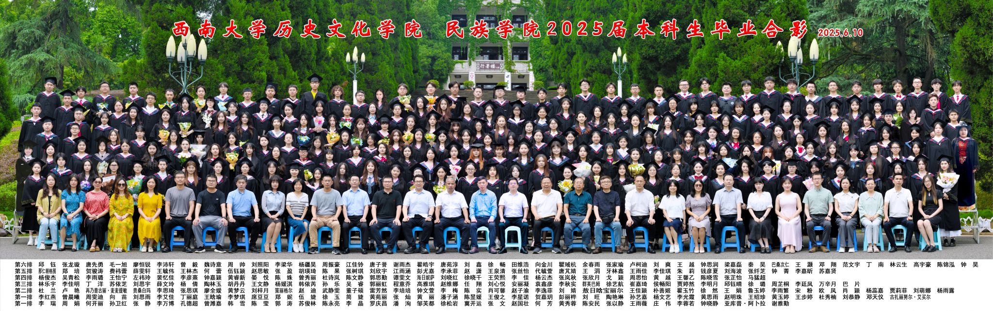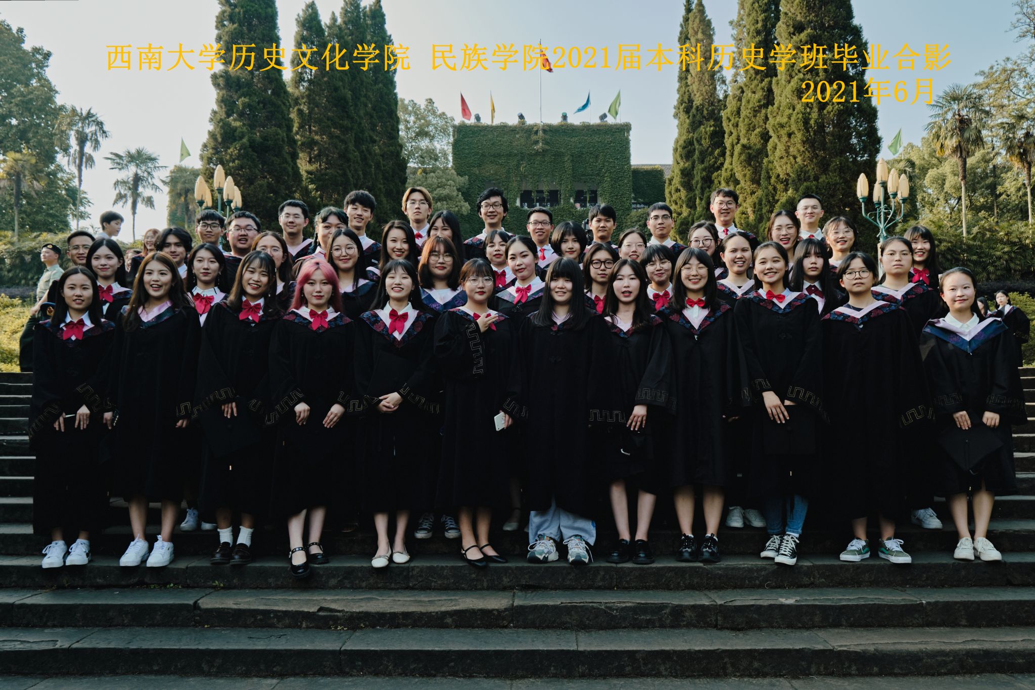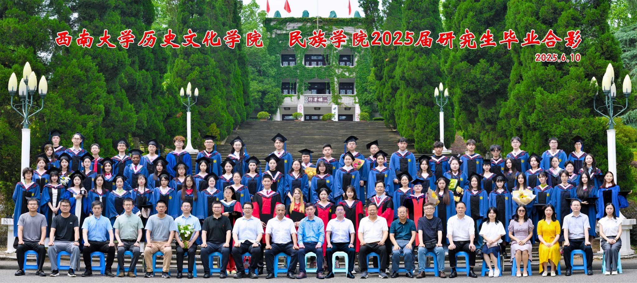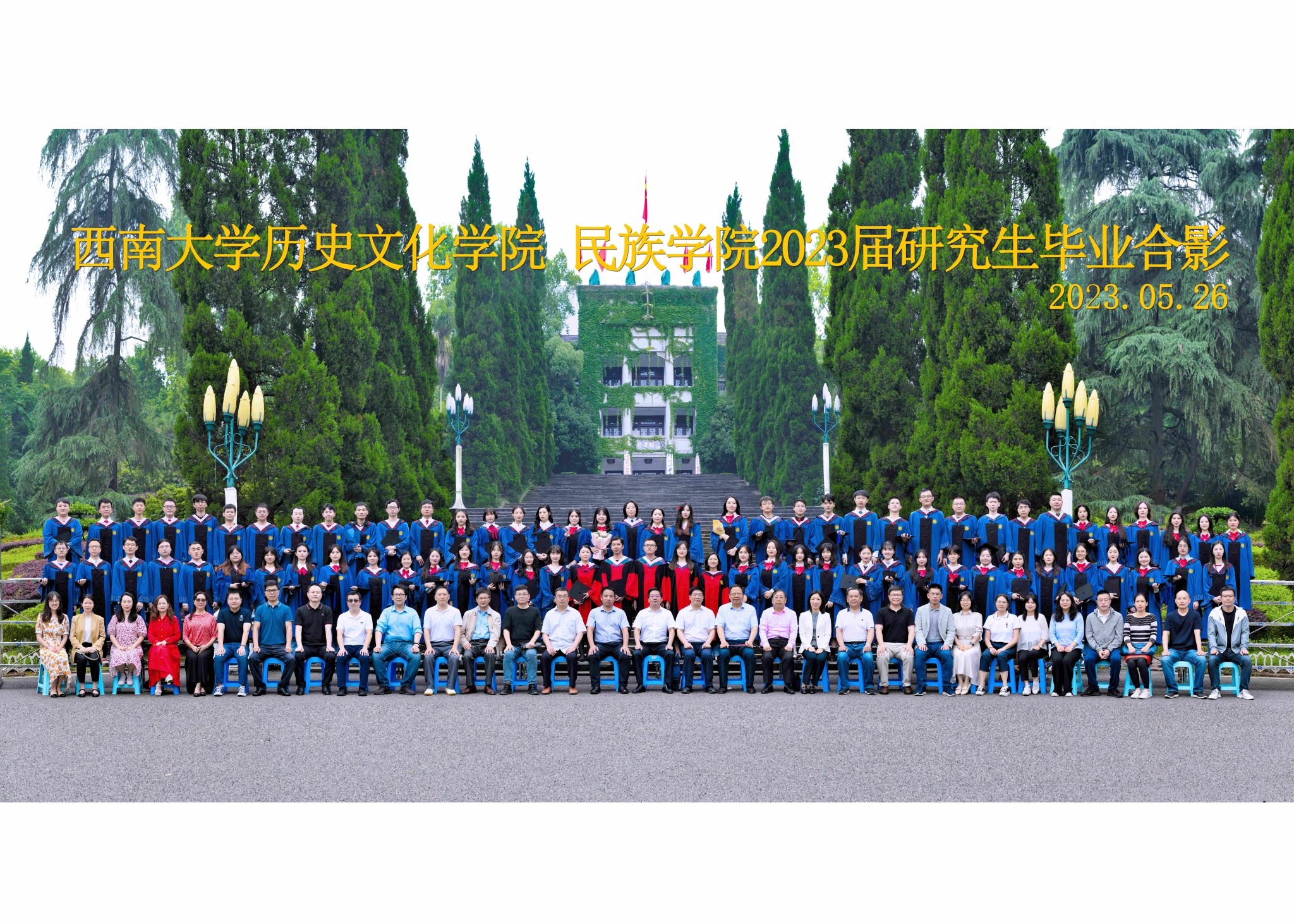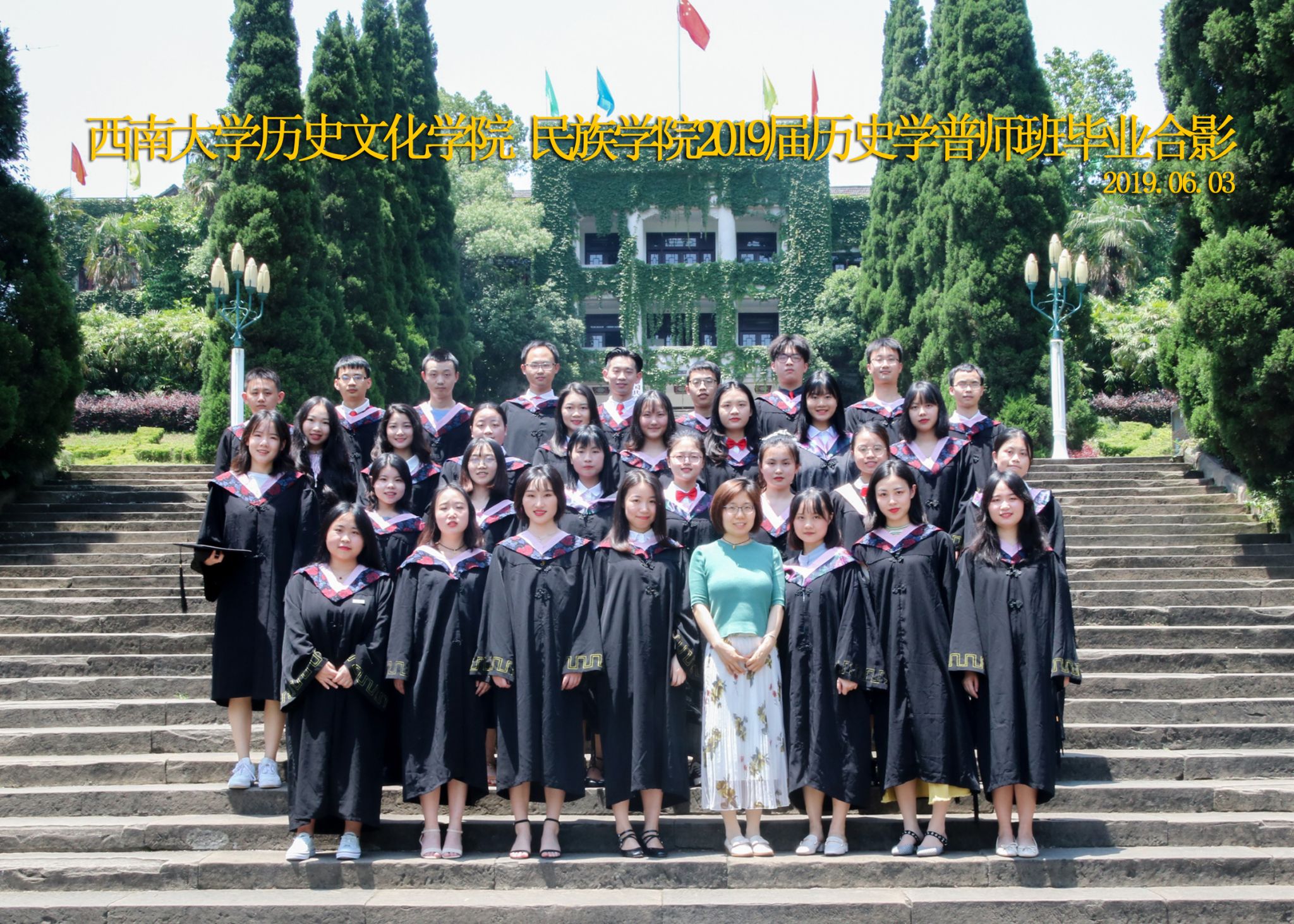 维我西大,滋兰育蕙,弘文兴农,英才济济,拔萃黉宫。含弘光大,学高足以传师道;继往开来,德厚自堪擎苍穹。母院兴教,身先其任:民族预科与民族学,功建中华民族共同体;历史教育与历史学,传承师道中华文明齐兴盛。传统史学,积淀深厚,蔚为大观;专业素养,与时俱进,新枝竞秀。长江文化研究,弘扬中华文明传统,后势可喜;中希文明互鉴,践履民族复兴伟业,前景光明。