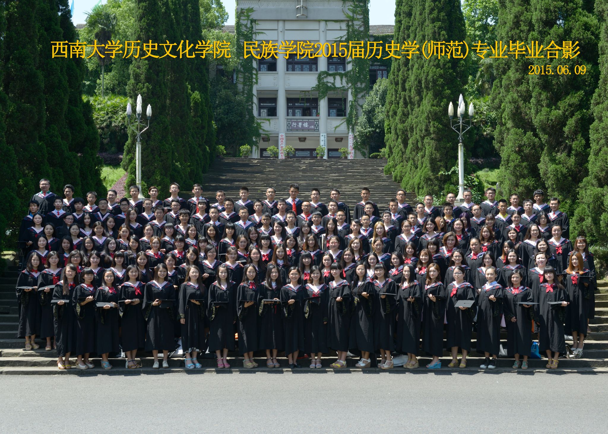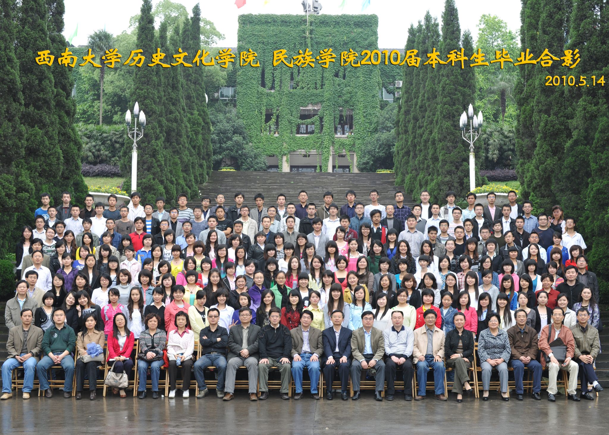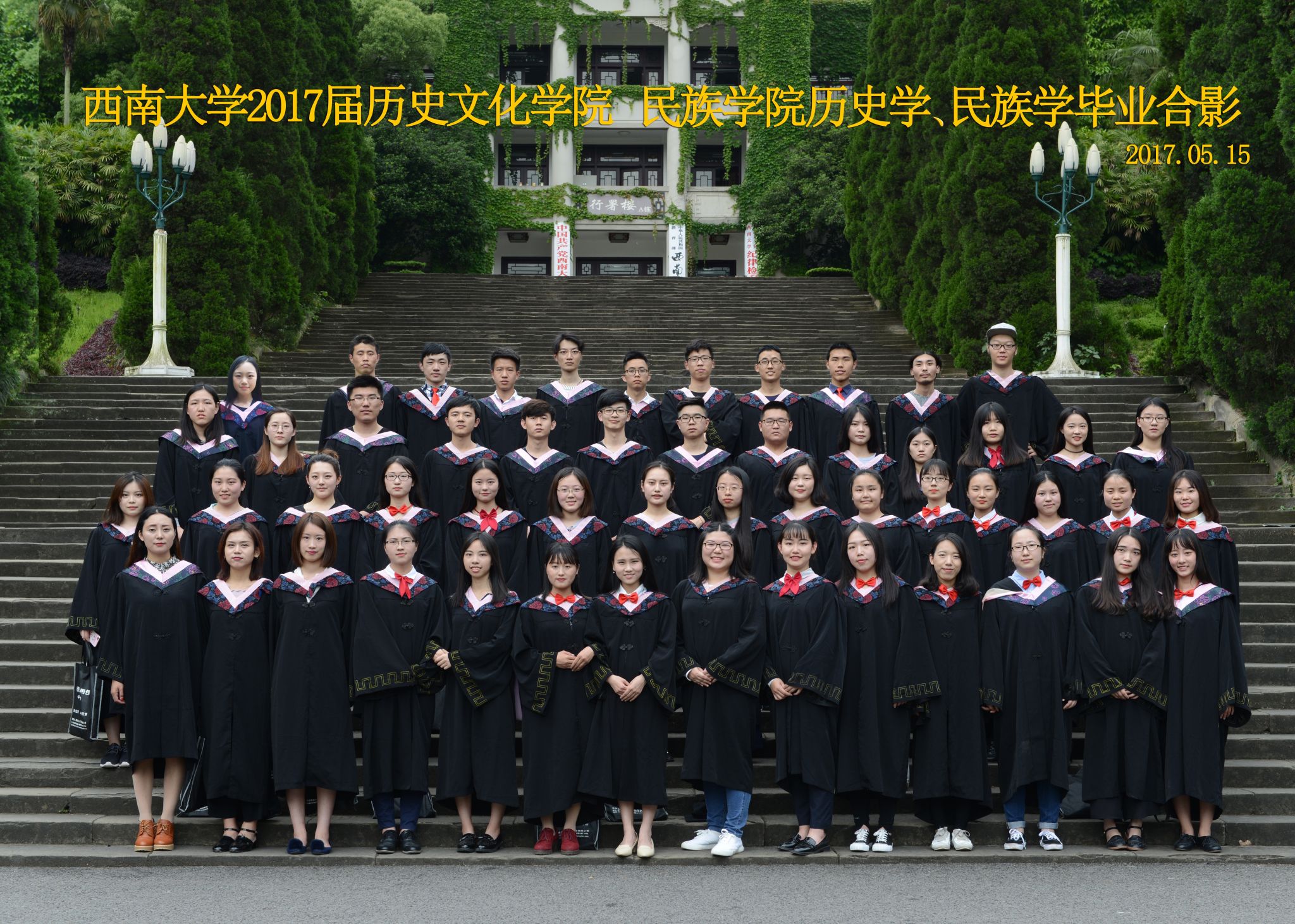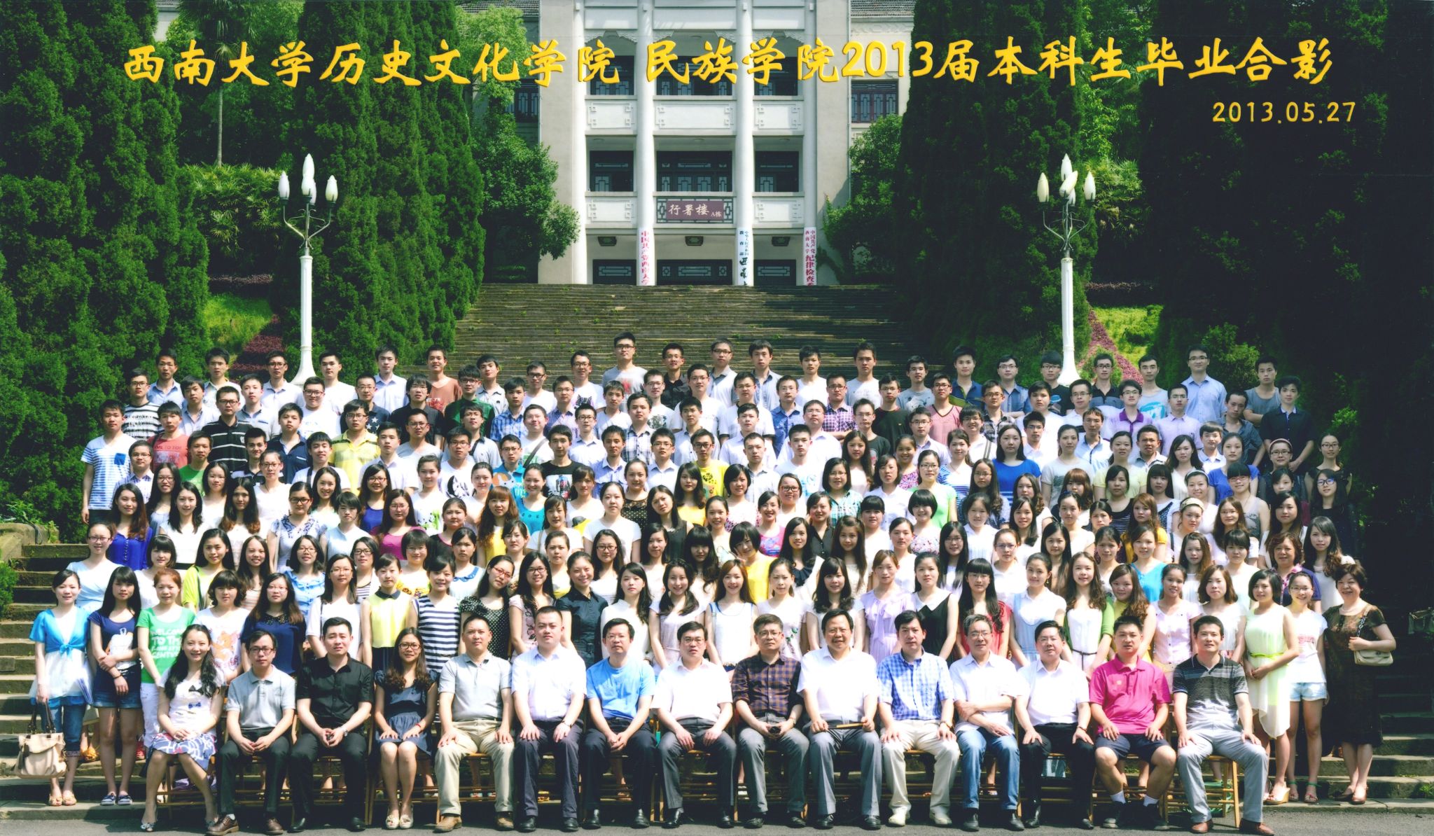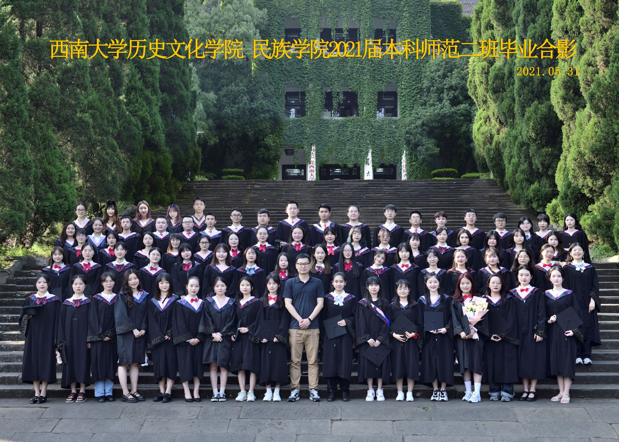 维我西大,滋兰育蕙,弘文兴农,英才济济,拔萃黉宫。含弘光大,学高足以传师道;继往开来,德厚自堪擎苍穹。母院兴教,身先其任:民族预科与民族学,功建中华民族共同体;历史教育与历史学,传承师道中华文明齐兴盛。传统史学,积淀深厚,蔚为大观;专业素养,与时俱进,新枝竞秀。长江文化研究,弘扬中华文明传统,后势可喜;中希文明互鉴,践履民族复兴伟业,前景光明。