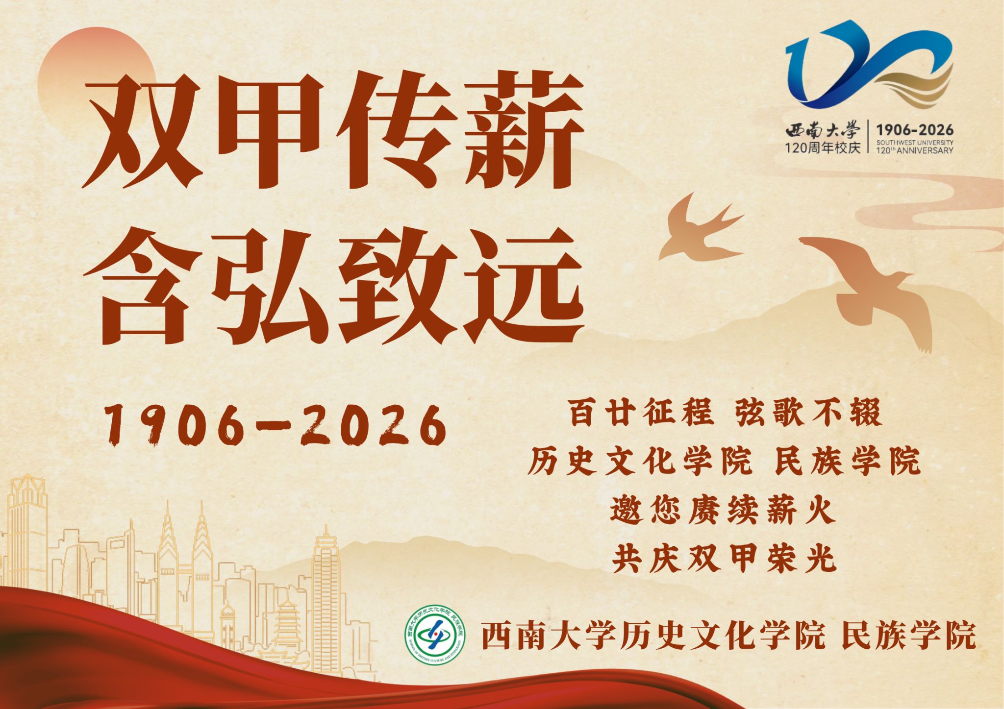 缙云叠翠,杏坛盛事相约重庆;嘉陵扬波,桂苑荣光嘉会西南。春风和煦,百蕙齐芳,2026年4月18日,西南大学将隆重举行120周年校庆。为共纪薪火襄文百廿时序,同启上庠功业双甲华章,诚邀广大校友同庆母校华诞!